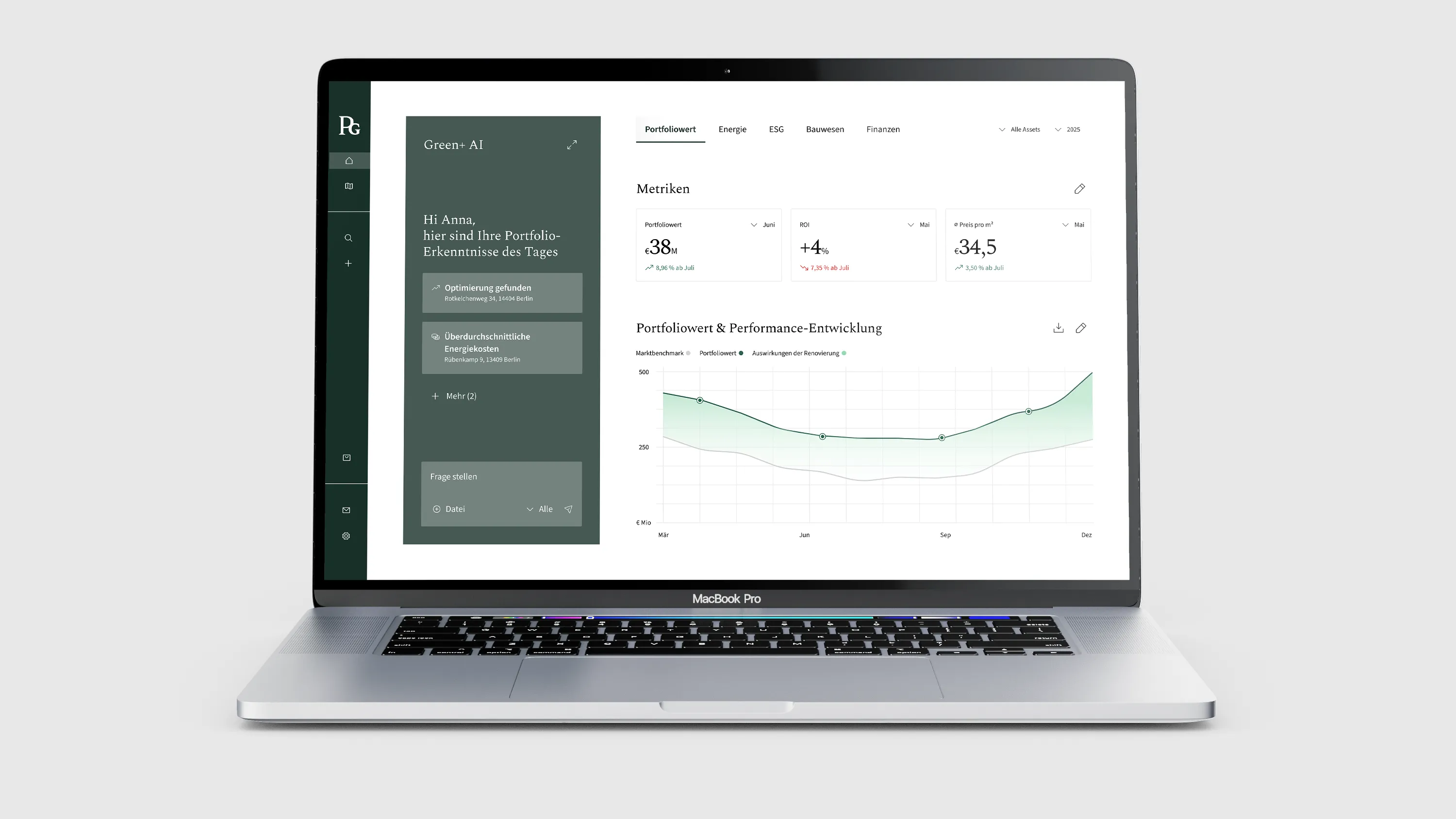 The proactive identification of critical performance problems and value-adding potential in the portfolio is particularly helpful. Green+ AI analyzes all assets, recommends targeted measures with a high ROI and takes user-defined strategies into account. Based on individual preferences, the system creates customized portfolio and asset reports that support well-founded and economically sensible decisions.